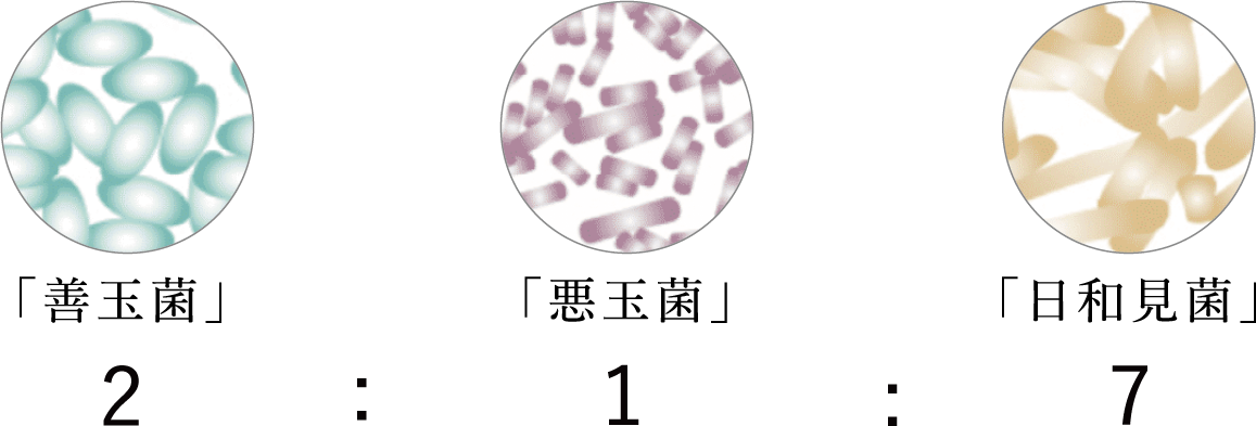 理想的な菌の割合は、「善玉菌」2割:「悪玉菌」1割:「日和見菌」7割とされています。