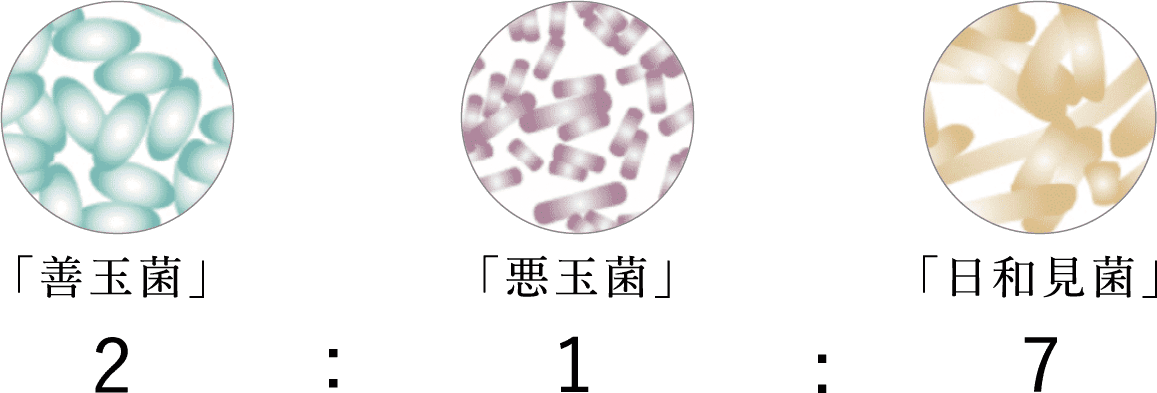理想的な菌の割合は、「善玉菌」2割:「悪玉菌」1割:「日和見菌」7割とされています。